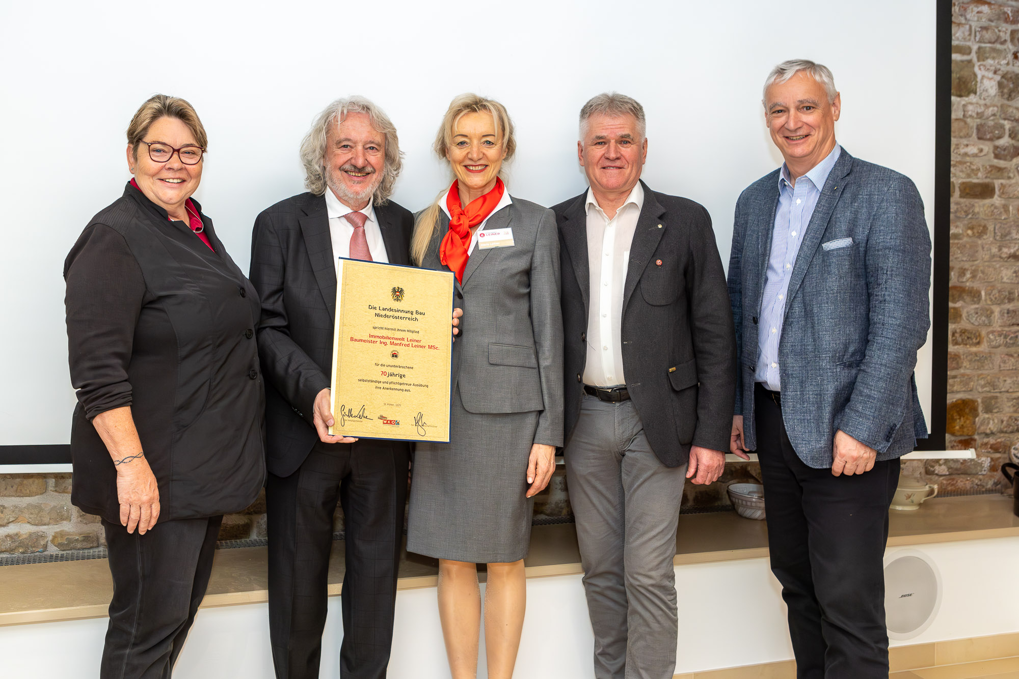 v.l.n.r.: Bürgermeisterin der Stadtgemeinde Schwechat Karin Baier, Manfred und Maria Leiner mit der Urkunde für das 70-jährige Firmenjubiläum, Bundesinnungsmeister der Bauinnung Robert Jägersberger und Landesinnungsmeister der Bauinnung Günther Lehner © Immobilienwelt Leiner