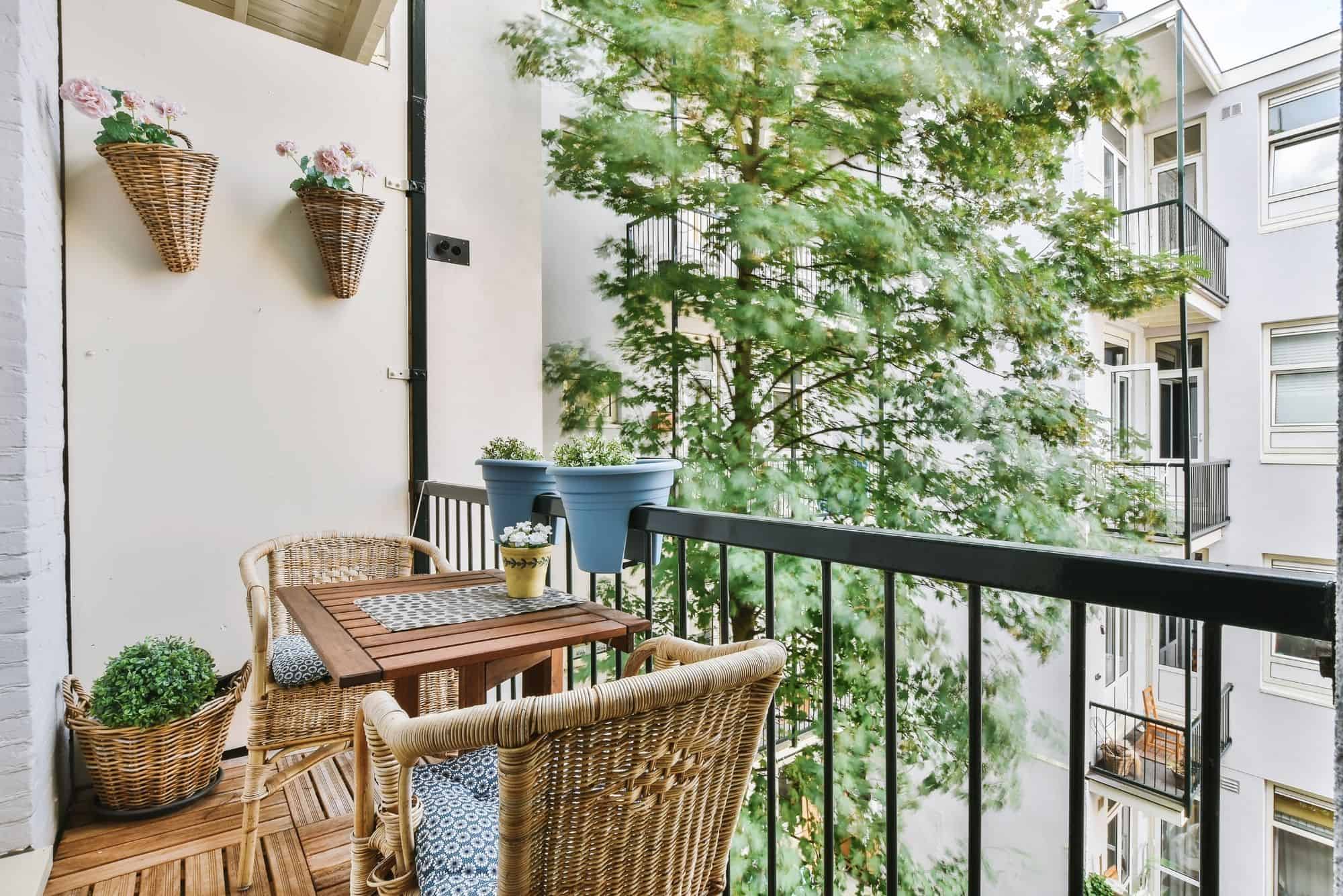 Auf einem kleinen Balkon sorgst du für mehr Privatsphäre mit Outdoorvorhängen.